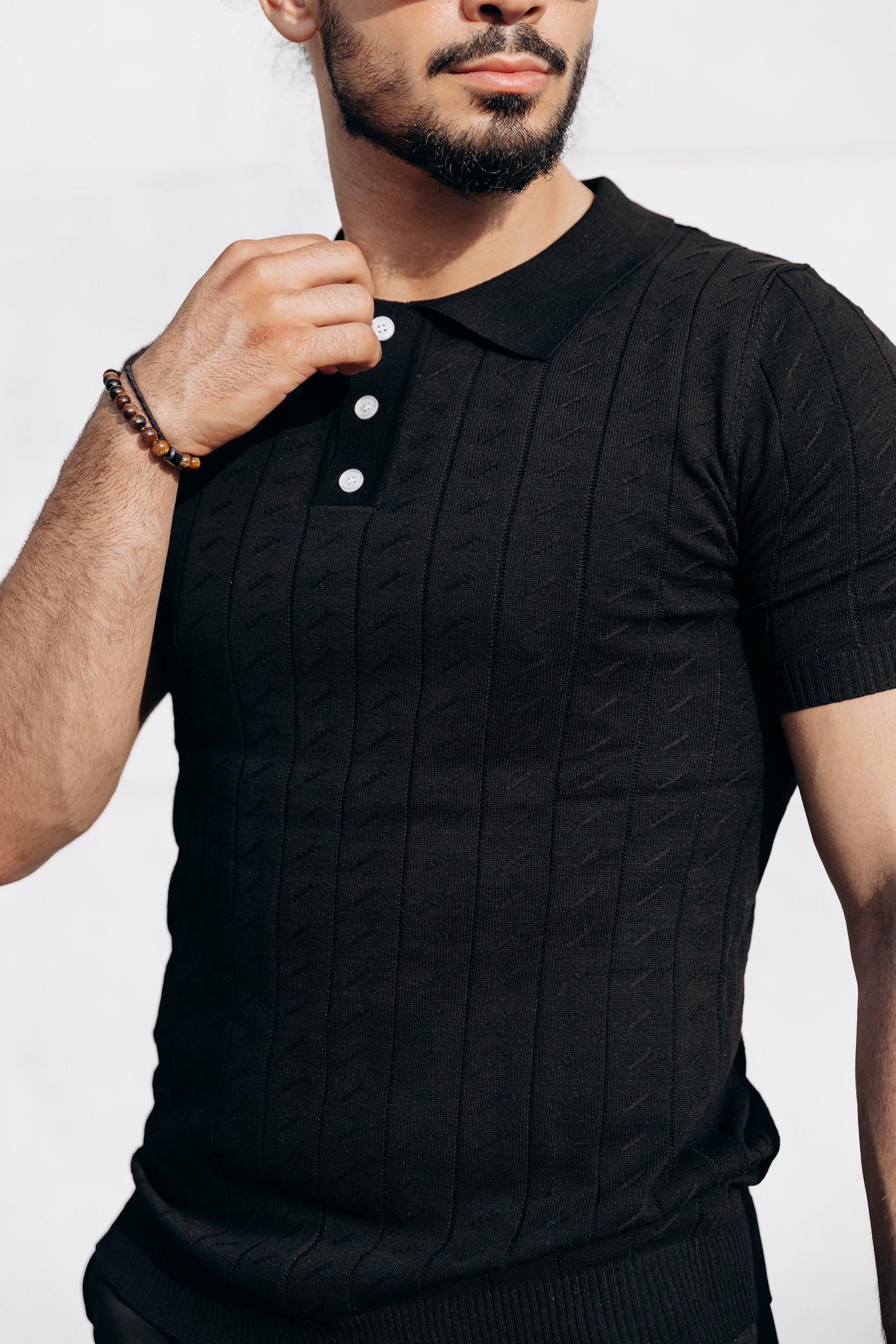 This black knit polo combines classic design with a sleek, contemporary edge, making it a versatile piece for both casual and semi-formal occasions. Its refined texture and tailored fit provide a polished look, while the buttoned placket adds a subtle, sophisticated detail. Perfect for styling with chinos, trousers, or even jeans.